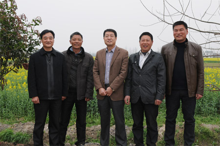 枝江酒業(yè)董事長(cháng)蔣紅星(左一)、黨委書(shū)記張華(左三)與泰洲村支書(shū)王明星(左二)等村委 合影留戀 3月11日,枝江酒業(yè)董事長(cháng)…