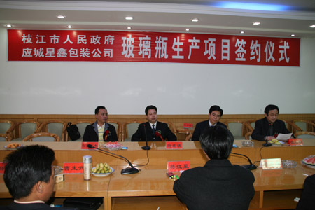 4月8日,枝江市市長(cháng)劉建新與應城市星鑫包裝有限公司董事長(cháng)胡志雄在枝江酒業(yè)行政大樓多功能廳簽下高檔精白料玻璃瓶項目投資協(xié)議。宜昌市委常委…