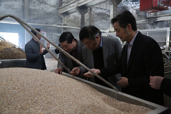 傅建偉在釀造車(chē)間查看糧食粉碎情況